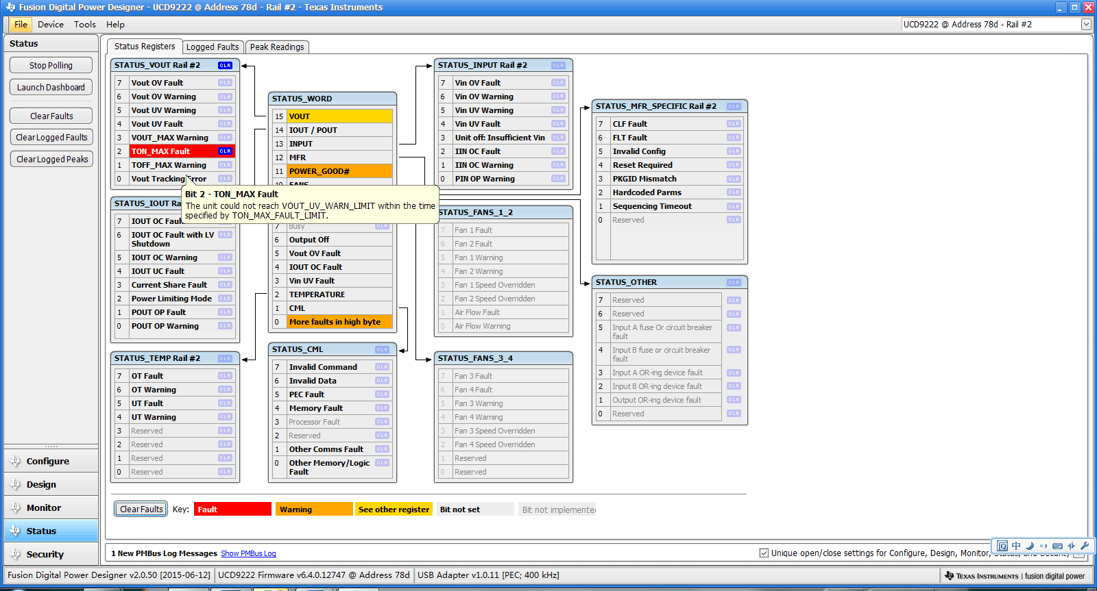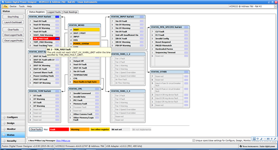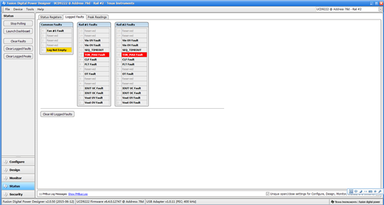 按照TI提供的C6678LE板卡资料A104-1做了一块6678, 在调试ucd9222+ucd7242电源时候,FPGA程序已经烧写进去,并且能够检测到FPGA把UCD9222的输出使能脚为高电平了,但是通过USB-to-GPIO 把板卡和PC连接以后,导入TI提供的《TMDXEVM6678L_UCD9222_16May11_ver5.xml》后,过软件Fusion Design Online 观测,发现并没有输出电压(PWM没有输出),在Fusion Design Online 的 “STATUS”发现,附件问题,不知道问题出在什么地方,怎么处理,谢谢!