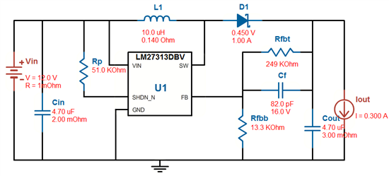 后来测试换了二极管,开机瞬间电压上冲至50V,将LM27313的内置mos管烧穿,SW端与地短路。现在感觉就是FB端电压没有从输出电压正确采样过来,FB端接的是EA的输入端,在加电前是对地短路。加电后FB端对地变为600多欧,芯片已被烧坏。