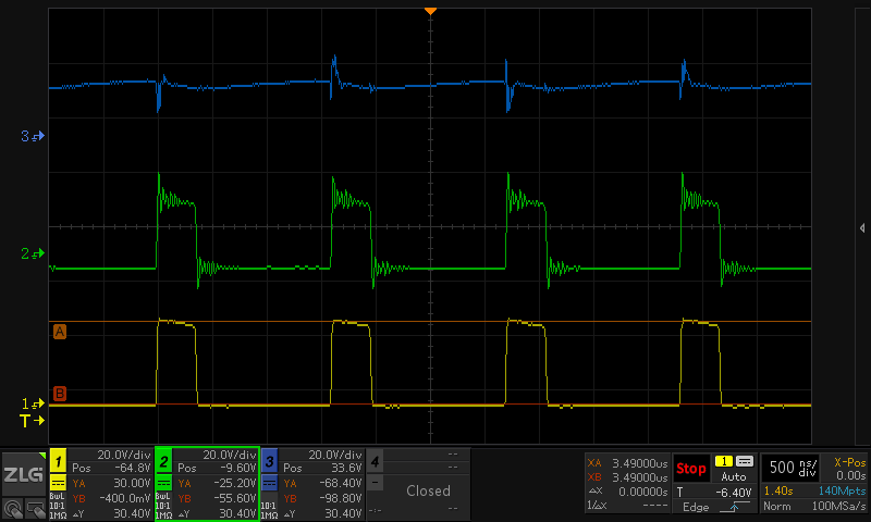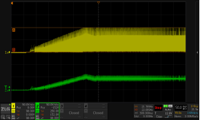 产品通入现场直流48V电源,该芯片LMR16030被烧毁,BOOT、SW、VIN引脚对地阻抗很低(欧姆级别),后续同一电源接入产品没出现烧毁现象。但是在排查问题时(正常产品实验室接入48V电源进行测试),发现上电瞬间尖峰电源偏大(90V最大黄色波形BOOT),以及出现振铃现象(绿色波形SW)。请问有什么改进意见吗?