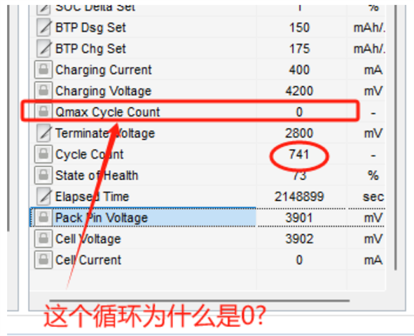 这边已经老化多次,但是Qmax Cycle CounI 一直都是 0 GAYGE-EN的使能是打开的