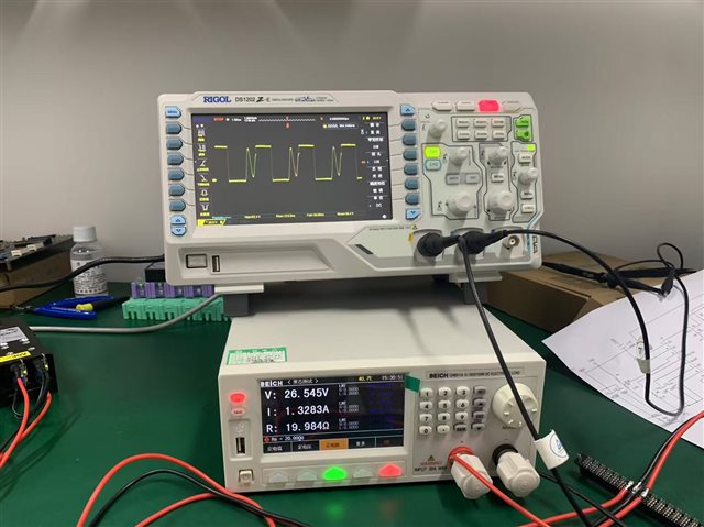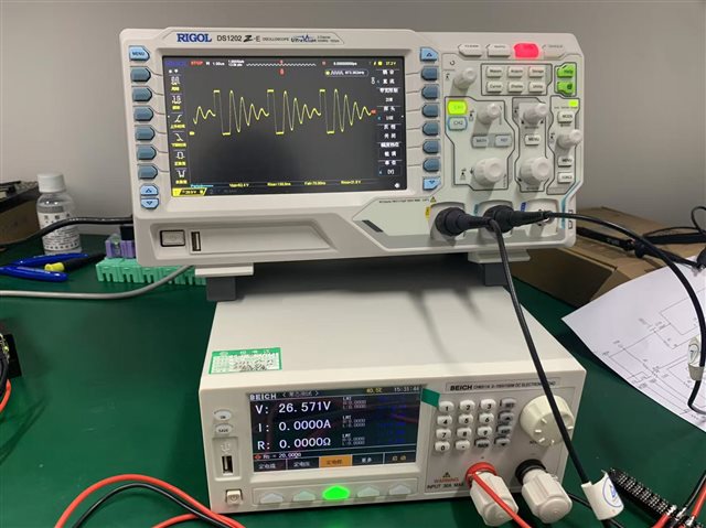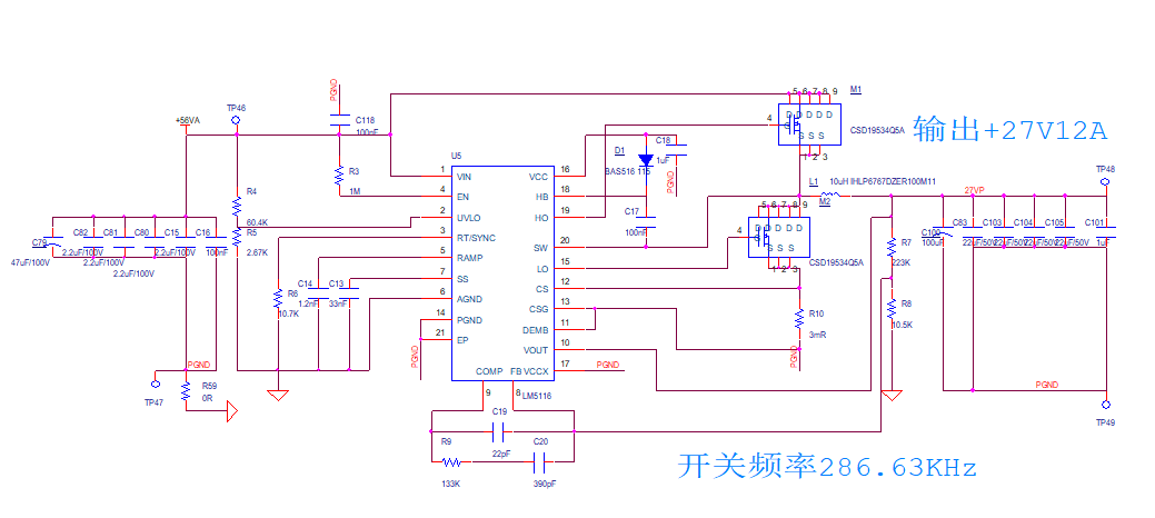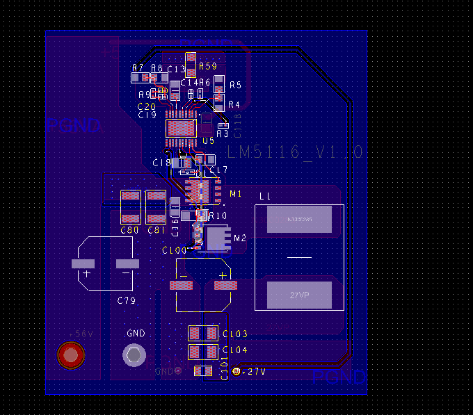 我设计了一个LM5116电路,需求是:+56V输入,+27V/12A输出;今天小板设计制板回来了,马上焊接上新品进行了测试!能够输出27V的电压,电流的话暂时拉到了5A,因电子负载功率有限,最多只能拉到5A。