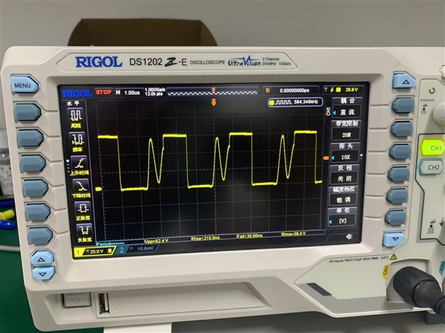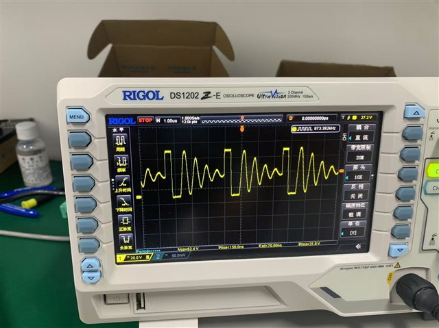 然后我使用电子负载进行了轻载1.2A输出!发现波形有类似方波出来,但是波形也不是标准的方波,而且频率也不对!如下图: