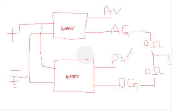 我现在电源设计用了2个LP5907-3.3v的LDO芯片,设计开始是锂电池供电,上面AV给芯片模拟部分供电,下面DV给数字部分供电,现在我手上有2块430LP,因为这个电源板设计出来是与430LP(5529)插排配合的的,,所以数字DV是带电压(3.3v电压,5V的没有用)的,然后锂电部分由于没有电池,我就用另外的430G2LP的VCC(测试3.5V)供电,发现G2在没上USB的情况下板载LED亮了。。。。。。