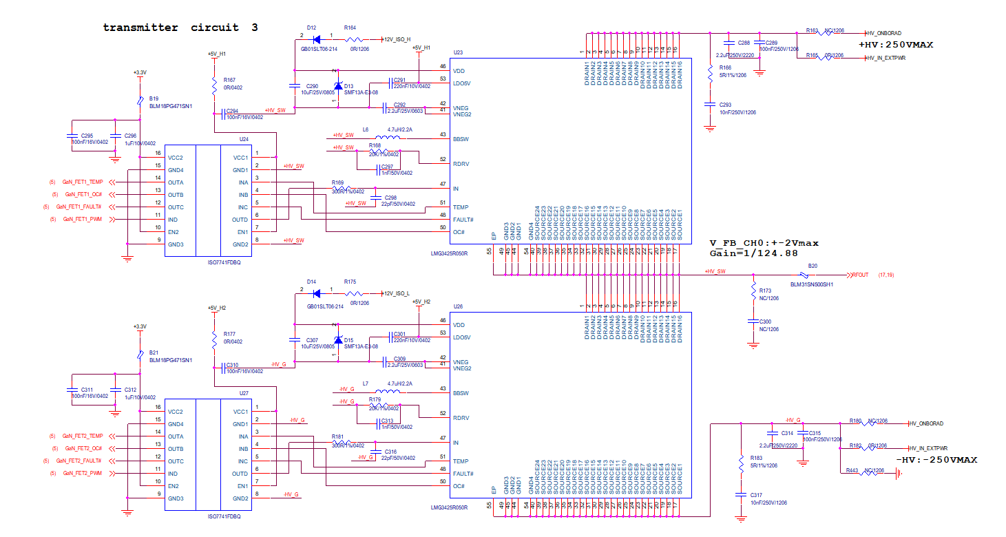 使用两片LMG3425R050完成图示的电路,驱动信号为1MHz,占空比50%的方波。当电路工作时,图中上方的LMG3425R050芯片(漏极施加正电压)发热显著高于下方LMG3425R050芯片(源极施加负电压),上方芯片TEMP脚测量温度上升速度显著高于下方芯片。
