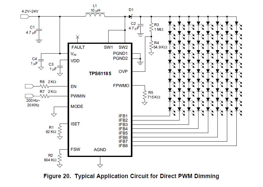 我选择了上图中的应用方案,我的输入电压是5v,输出电压是32v(每路10个3.2vled灯串联,一共8路),输出电流是0.15A(每路0.018A,一共8路),根据我的这个要求,上图中哪些元件的参数需要修改,改为多少?另外图中没有D1位置的元件参数,应该是多少?麻烦您给我解答一下好吗?