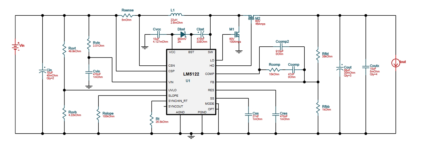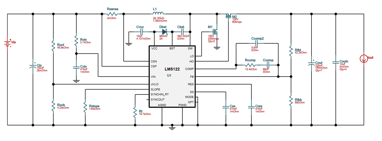 项目输入电压18V-36V,输出电流3A,设计要求输出48V和76V两种电压(通过MOS开关控制FB脚分压电阻并联值,输出48V或76V),在WEBENCH仿真得出的电路图输出48V和76V的电压的话,电感、COMP脚阻容值和SLOPE脚电阻值和SYNCHIN_RT脚电阻值都不一样,我应该选择哪些参数的器件,如果LM5122芯片不合适的话  有没有比较合适的芯片。