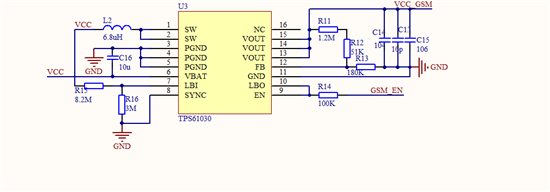 大家好,我在使用TPS61030时,出现电压跌落比较严重,输入源为18505 3.6V电池,输出为3.9V,给GSM模块供电,在模块注册网络时就会出现模块重启,此时输入电压跌落至1.8V。不知道是哪的问题,