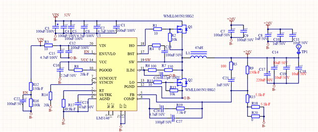 lm5146调试,输出52V输出24V,只能稳定输出2A左右,调整开关频率 100k,电感改为100uH ; 开关频率200k,电感感量47uH;开关频率300k电感35uH,都是只有2A左右,ILIM口调整阻值大小,对输出没有影响。下管驱动波形持续200nS左右,发波不正常