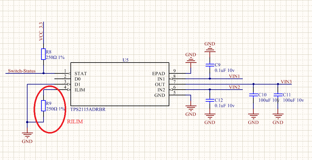 TPS2115ADRBR的手册上说可以输出2A的电流,RILIM 该设置为多大才能得到最大的电流输出呢?我设置为250欧姆,好像带不动我的负载。