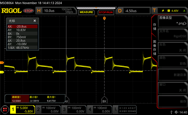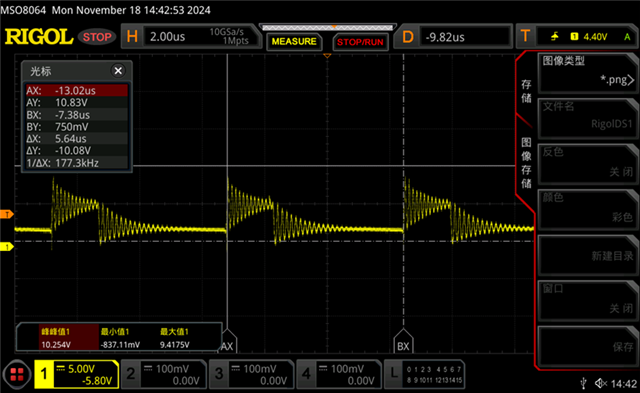 图一为正常路驱动经过电感之后(LED+)的电压波形,图二为异常路驱动经过电感之后(LED+)的电压波形