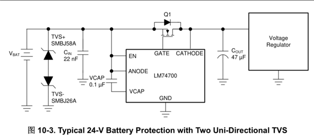 关于24V系统的时候,LM74700参考设计选择了SMBJ58A这个TVS管,然后这个TVS的Vcl电压达到了90V,远大于LM74700的ANODE的65V,如果做7637-2中2a的波形时,会不会把芯片打坏呀