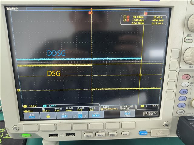 你好,我们的BMS使用BQ76952作为前端芯片,在测试短路保护时,发现短路保护能生效,但是时间偏长,设置延迟为45us,实际保护时间在30ms左右,图中黄色部分为电流,蓝色部分为MOS驱动电压,请结合寄存器配置帮忙分析下可能导致保护时间会偏长的原因