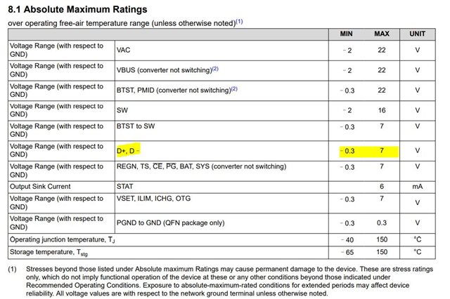 您需要注意绝对最大额定值,如果超过绝对最大额定值可能会损毁器件,https://www.ti.com.cn/cn/lit/ds/symlink/bq25606.pdf#page=8