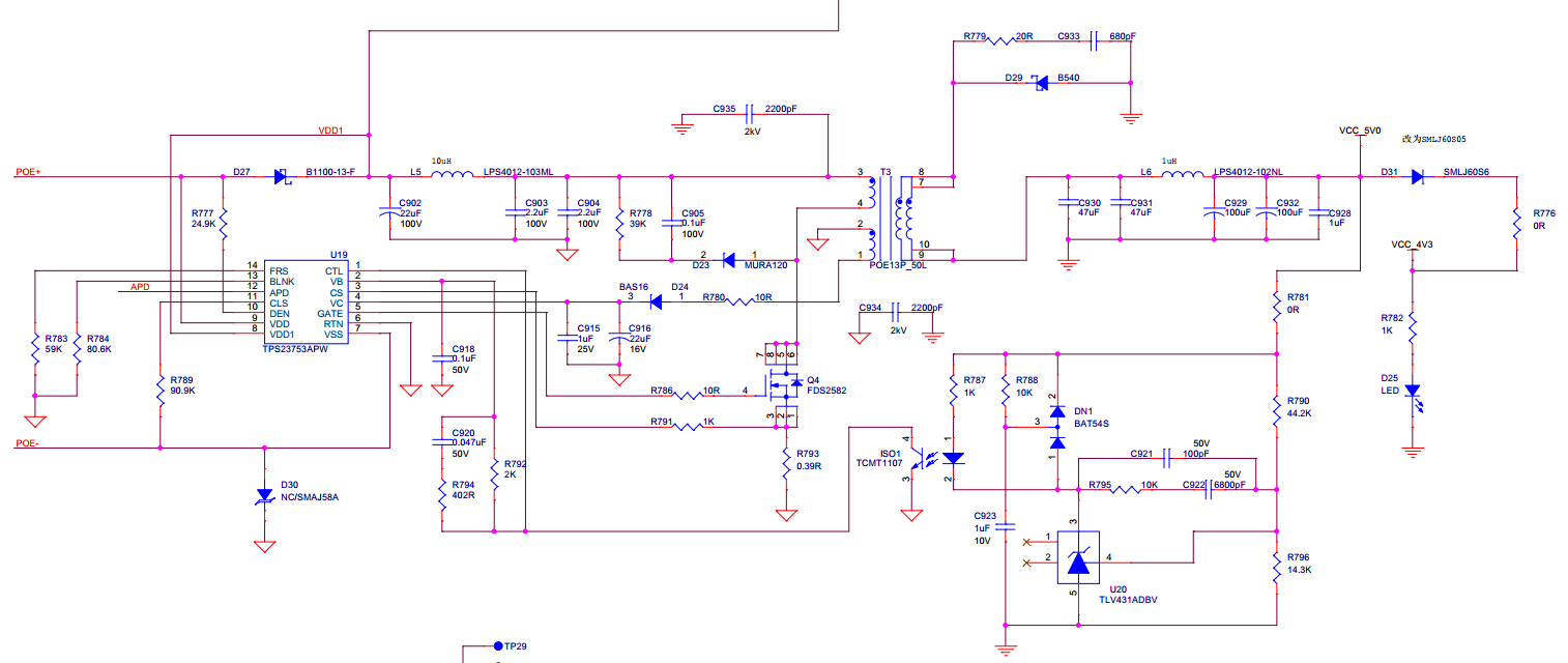 用了一款POE芯片TPS23753APW,结果电源纹波较大Vpp=160mV,输出电容换成高频低阻电容,改善不大,