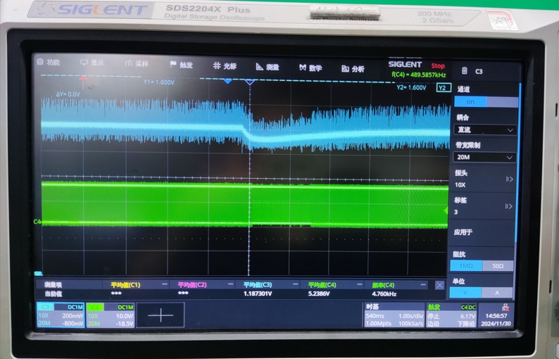 我们使用TPS5430DDAR作为15V转5V的降压芯片,该设计已在量产中,目前发现有几例低温时5V输出异常的电路板,最终定位到是电源芯片TPS5430DDAR的4脚在低温时(10度以下即会出现,出现概率100%)电压会跌落(由基准1.221V跌到1.107V左右,对应示波器波形通道3),而同一批次的其他电路板和芯片没有这个情况。请问这是什么原因导致的,附上器件外围原理图和芯片4脚低温下电压跌落的波形图。