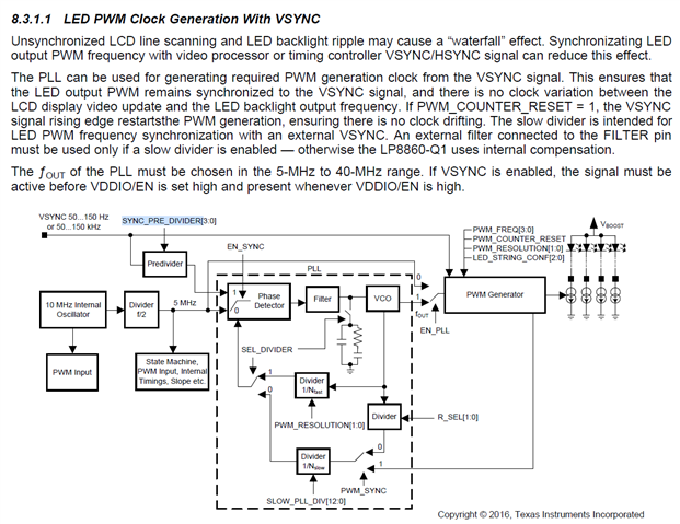 I used "LED PWM Clock Generation With VSYNC" function of LP8860-Q1, VSYNC is 60HZ
