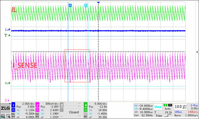 When the current is (0~30)A, the voltage waveform output by the imon pin of drmos will have a fixed period (around 60 kHz) of low-frequency oscillation.