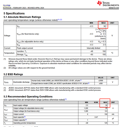 一般概念中,Absolute Maximum Ratings 值应更大一些,比如类似LDO芯片该值为35V。请问TLV709的极限输入电压是否确定是30V,而没有留出裕量?