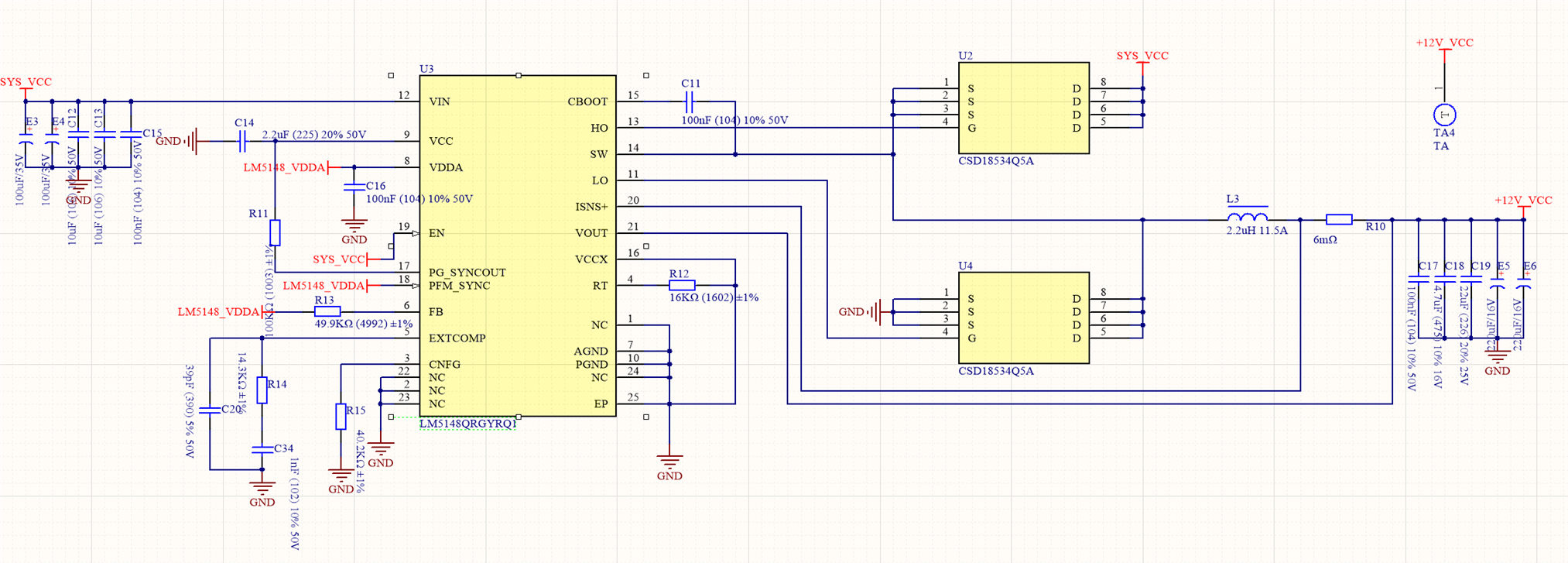 LM5148的电源输入为27V/4A规格电源适配器,其输出设置为12V,在负载较轻时(大概200~300mA输出)表现一切正常,当带上1A以上负载时,芯片立刻无法输出且去除负载后VDDA、VCC均无法再正常输出电压,异常现象重新上下电无法恢复。麻烦帮忙看下,感谢!