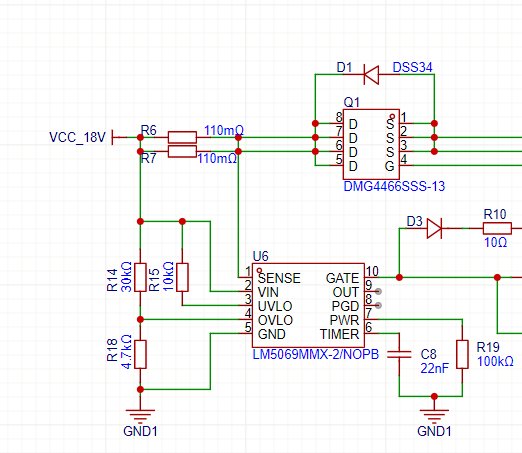 在使用两个LM5069芯片做双重保护时还遇到另外一个现象,在输入端施加18V电压没有输出,用万用表量OVLO引脚电压为2.42V左右,测量完OVLO引脚之后MOS管就被导通,如果不用万用表测量MOS管一直不导通。