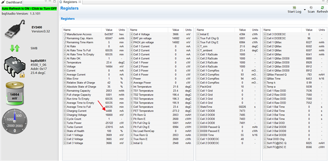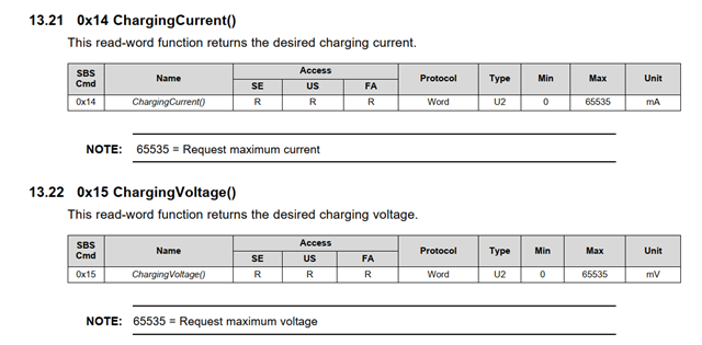 如图所示,我没有给电池充电,为什么读取的充电电流会是4A?这里的充电电流和充电电压是指允许的最大充电电流和充电电压吗?(英文水平有限,不太理解手册上的描述) 根据技术手册描述,这两个寄存器是只读的,那这两个参数是怎么来的呢?