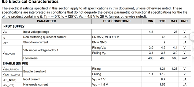 您好,在电阻设计中EN引脚的R4和R5应该如何设置,我是使用帖子里的excel计算的,但是我不清楚输入电压VIN和V_start,V_stop的关系。