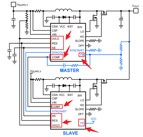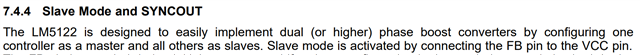 请教一个问题,LM5122芯片由D触发器实现的四相交错BOOST电路,FB管脚是不是和两相交错BOOST方案一样,只有主芯片FB管脚接Vout分压电阻,其他三路接Vcc?