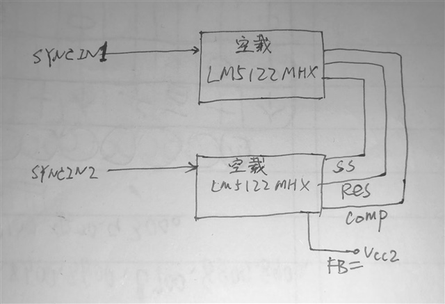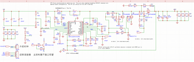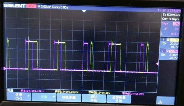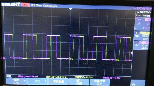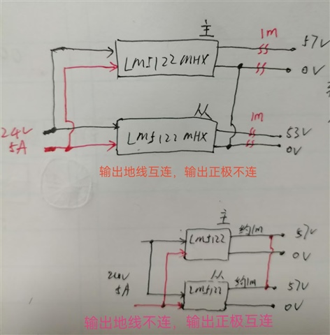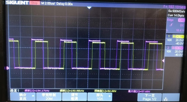 2、如果从机输出正极和主机正极不并联,上电后,主机正常输出57v,从机输出53v;如果此时将从机和主机的正极连接,则主从机都可以是57v;此时驱动波形看起来正常。