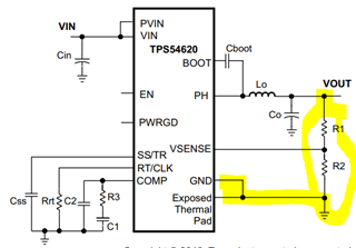 我建议将环路减少到顶部和底部 FB 电阻器、并将底部 FB 电阻器正确接地到外露的 thermad/GND、然后让顶部 FB 电阻器直接连接到 VOUT 节点、如下所示: