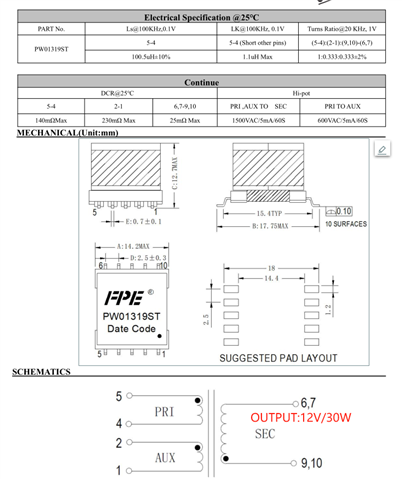 1、关于PMP22806这个DEMO设计里面的变压器,Ti参考设计中使用的型号是:LDT1069-50R,但是这个型号似乎较难采购,请Ti的专家帮忙评估下如下变压器是否可以使用,如可以使用,外围电路的参数需要做变更吗?