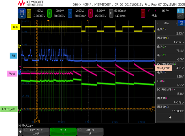 无负荷启动没有问题,微小负荷(0.2A负荷电流、设计额定电流25A)接续后,14.3Vtyp的出力电压出现急上升的情况(CH3为出力电压波形,出力过电压保护值16V)。