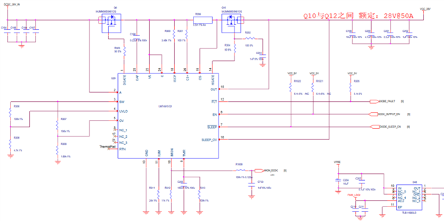 我的板子用了个LM74910,原理如图。输入电压连接到A引脚,电压是28V。现在我给EN和SLEEP高电平后,DGATE比A的电平只高出3.5V(手册里是9.5~14V);而HGATE是正常的,比OUT高12V。VCAP电容两端也有12V压差。