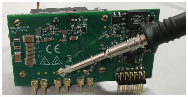 Unfortunately, the board does not have provision for device switching current measurement. For providing the PWMs and other power components, the LMG342X-BB-EVM motherboard can be used. Additionally by altering the switching node connection, hard-switched conditions can be created for both Top and Bottom side switch.