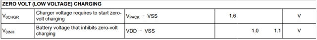 您好,您可以参考数据手册19页“7.3.15 Zero Volt Charging (ZVCHG)”了解关于0V充电,https://www.ti.com.cn/cn/lit/ds/symlink/bq27z746.pdf#page=19