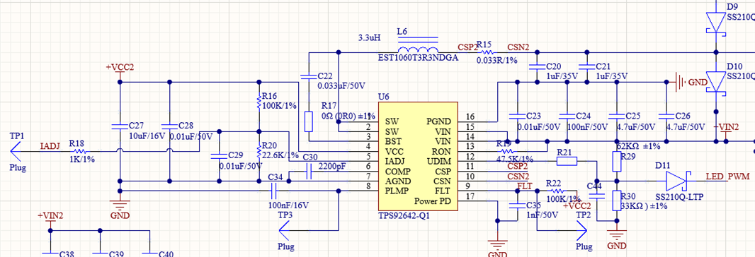 使用TPS92642EVM-203 驱动电路,UDIM输入99%占空比,IADJ设置1V,测试LED负载驱动。负载LED 160MA正常;加大LED负载,电压输出降低,无法实现大电流驱动。原理图如下,公司有技术解决方案请联系我。