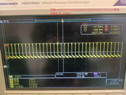 负载场景3:用3欧姆功率电阻并入负载场景2,模拟大功率LED负载测试,Vout=1V,测得负载模拟电阻电流450MA, FLT信号拉低.