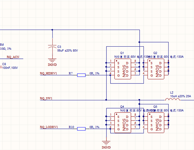 您好,我目前输入48v13A输出43v 10A,为了改良mos温升问题,在buck部分的上下管进行了并联mos,但是驱动波形异常了,单mos波形比较正常,双mos驱动异常,请各位帮忙看一下啦(芯片驱动电源5v是由外部电源供电,没有用芯片自身的)