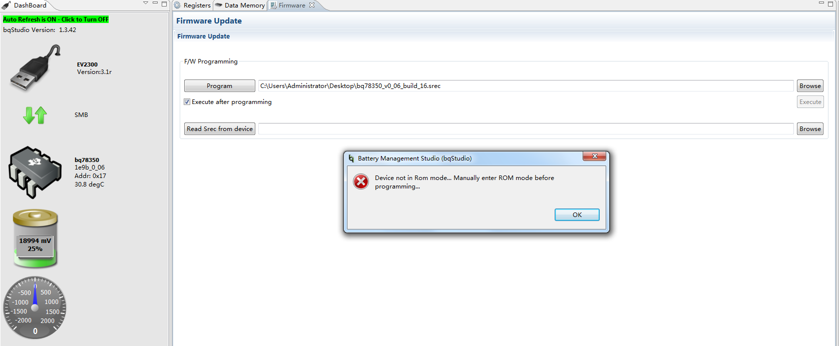 请问BQ76930怎么设置ROM模式,我重新加载固件时一直出现如附件所示的警告,怎么办?