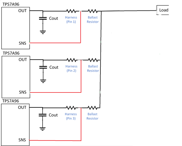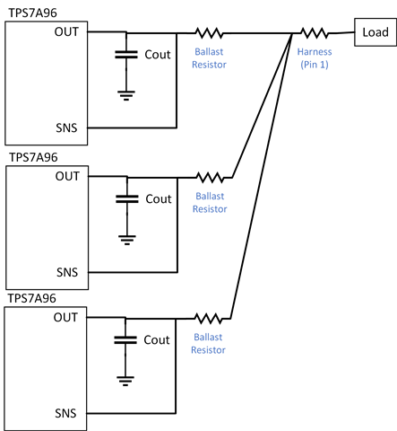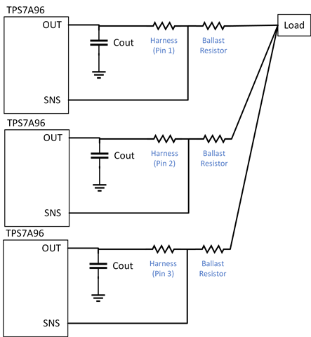 如果并联LDO的负载电压线束中只有一条导线,则必须将镇流电阻器放置在线束之前。大致如下: