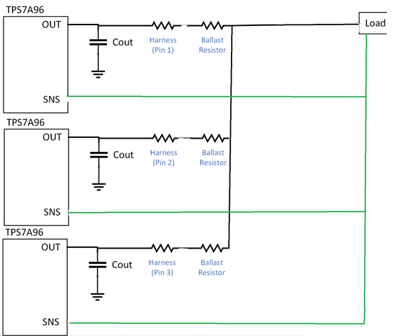 当您使用镇流电阻器技术并联时,LDO的远程感测连接必须始终位于镇流电阻器之前。但是,如果线束有3个引脚,每个LDO输出电压对应一个引脚,那么您可以将线束的直流电阻用作镇流器电阻的一部分(或全部)。这样你就不会有那么多的直流压降。大致如下: