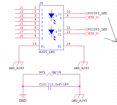 我们目前的设计:单独将网口的外壳,通过1MΩ的电阻与2.2nF的电容跨接到后端数字地