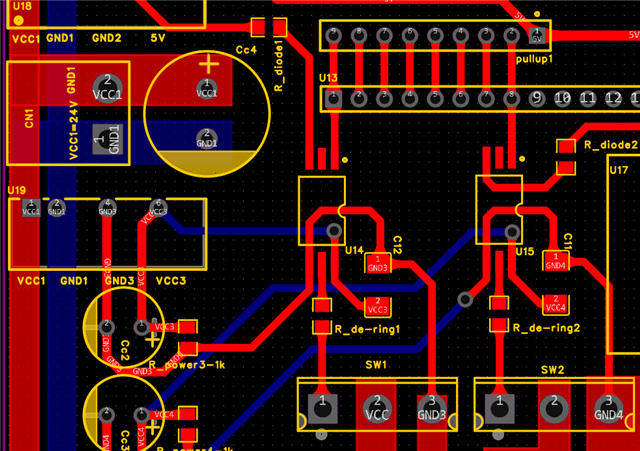 More, the capacitor C12 is connected to an isolated power supply which can be seen as U19 with an output of 12V between VCC3 and GND3, and C11 also has an isolated power supply in another part of the whole circuit.