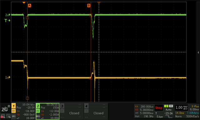 在测试短路保护时,从波形上看到放电MOS出现了两次关闭,时间间隔为5ms