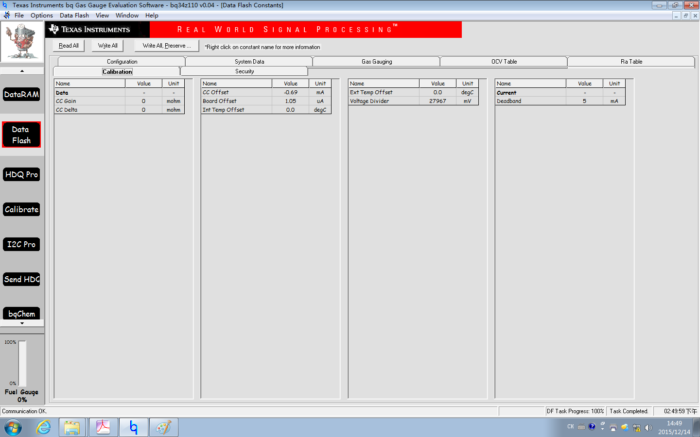 TI工程师,有几个问题想请教一下,我现在用BQ34Z110与MCU之间IIC通讯正常。但是用EV2300和EVSW上位机软件检测电压、电流、温度时,对测量值有疑问,刚开始三个值都不对,后面我用EVSW软件中calibrate目录里对参数进行校对,发现电压测量正常,但是电流,温度还是不正常。附件是我配置后的截图。我想请问一下: