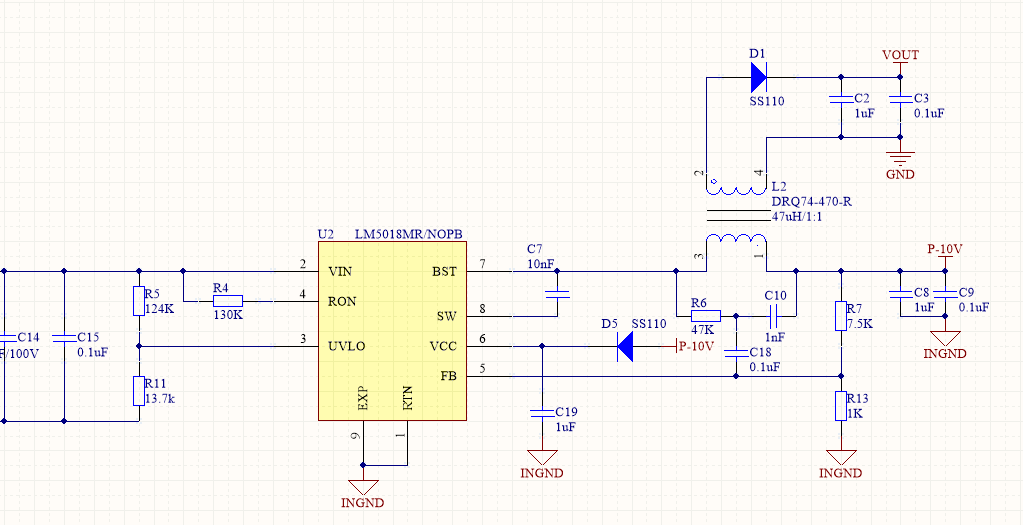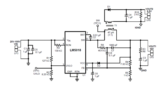 用LM5018MR设计了一个小功率的flybuck,原理图基本和评估版上的一样,但是我的电路却出现了问题。
