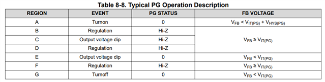即使VIN不符合通电电压,PG也将为零。它的设计目的是在UVLO、dropout和关机时输出0,而不会出现不受控制的状态。只有当FB上的比较器被触发时,它才应该是Hi-Z(在您的情况下拉高到VBIAS)。