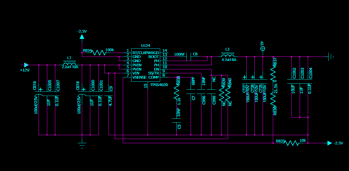 改成-2.5V输出时,电流最大只能到1A,各元器件值相同,求大神指教