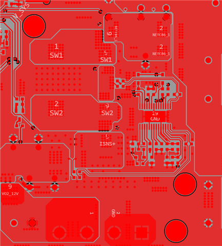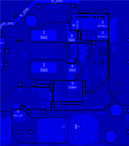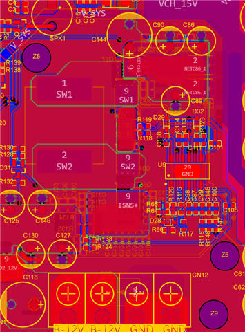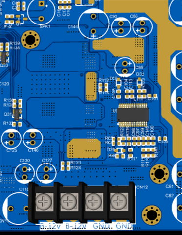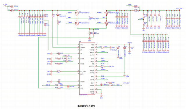 使用LM5176管控的升降压电源,前端两组电源切换,一组主电源12V50A,另一组满电14.4V的磷酸铁锂电池组,自动切换输入到LM5176电源输入端,输出12V负载最大15A,功率NMOS管使用的是HYG025N06LS1C2,60V170A,导通电阻2.5mΩ@10V,