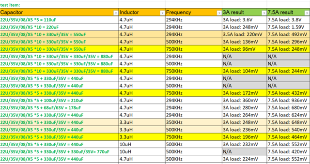 In addition, I have tested different switching frequencies (294kHz, 500kHz, and 750kHz) and inductor values (3.3µH to 10µH). All inductors used have an Isat of at least 15.5A. Despite these adjustments, the ripple under a 7.5A load remains relatively high (please refer to the attached screenshot).