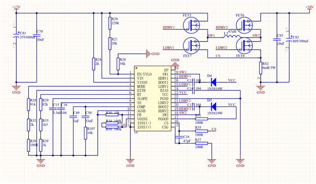 芯片21脚LDRV2无波形输出,其余3个驱动脚均有符合预期的100k波形出现。